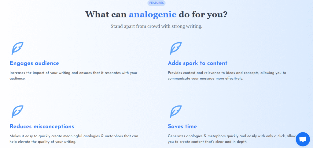 ◀︎ تتمثل مهمة Analogenie ورؤيتها في تمكين المستخدمين من خلال تعزيز قوة كتاباتهم لجعلها أكثر تأثيرًا وجاذبية وقابلية للفهم. تسعى الأداة إلى سد الفجوة بين الأفكار المجردة وقدرة الجمهور على استيعابها، وذلك عبر تقديم مقارنات مألوفة تساعد القارئ على ربط المفاهيم الجديدة بتجاربه السابقة. يتم الترويج لها كـ “مساعد بنقرة واحدة” ، مما يؤكد على تركيزها على السرعة وسهولة الاستخدام كعناصر أساسية في تجربة المستخدم، ومساعدتهم على “التميز عن الآخرين بكتابة قوية”.