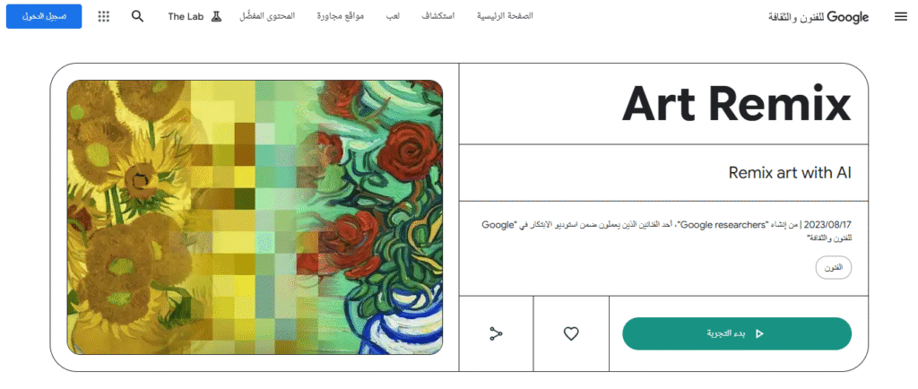 ◀︎ تُمثل أداة Art Remix من Google Arts & Culture واحدة من التجارب الإبداعية المتقدمة التي تجمع بين الفن الكلاسيكي وتقنيات الذكاء الاصطناعي الحديثة. تم إطلاق هذه التجربة ضمن مجموعة “Experiments” التي تقدّمها Google بهدف تمكين المستخدم من إعادة تشكيل الأعمال الفنية التاريخية بطرق جديدة وفريدة، دون المساس بهويتها الفنية الأصلية. تعتمد الأداة على دمج خوارزميات معالجة الصور وتقنيات تحليل الأسلوب (Style Analysis) لتتيح للمستخدم توليد أعمال جديدة مستوحاة من لوحات عالمية شهيرة، مع الحفاظ على التفاصيل الفنية الدقيقة التي ميّزت هذه الأعمال عبر التاريخ.