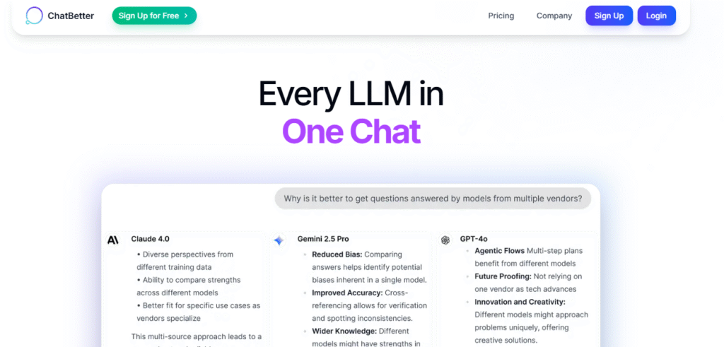 ◀︎ تُعد ChatBetter منصة ذكية تجمع “كل نماذج اللغة الكبيرة (LLMs) في دردشة واحدة” — فكرة بسيطة وفعالة: بدلاً من اختيار نموذج بعينه في كل مرة، يوفّر ChatBetter واجهة واحدة تتيح الوصول إلى كافة المزودين الرئيسيين (OpenAI، Google، Anthropic، xAI، Mistral، Cohere، وغيرهم) ويختار تلقائيًا أفضل نموذج لكل استعلام بحسب نوع المهمة. هذا يعني أنك لا تحتاج أن تخمن أي نموذج هو الأنسب — المنصة تتكفّل بالاختيار تلقائيًا وتحسّن فرص الحصول على إجابة صحيحة أو أكثر دقة.