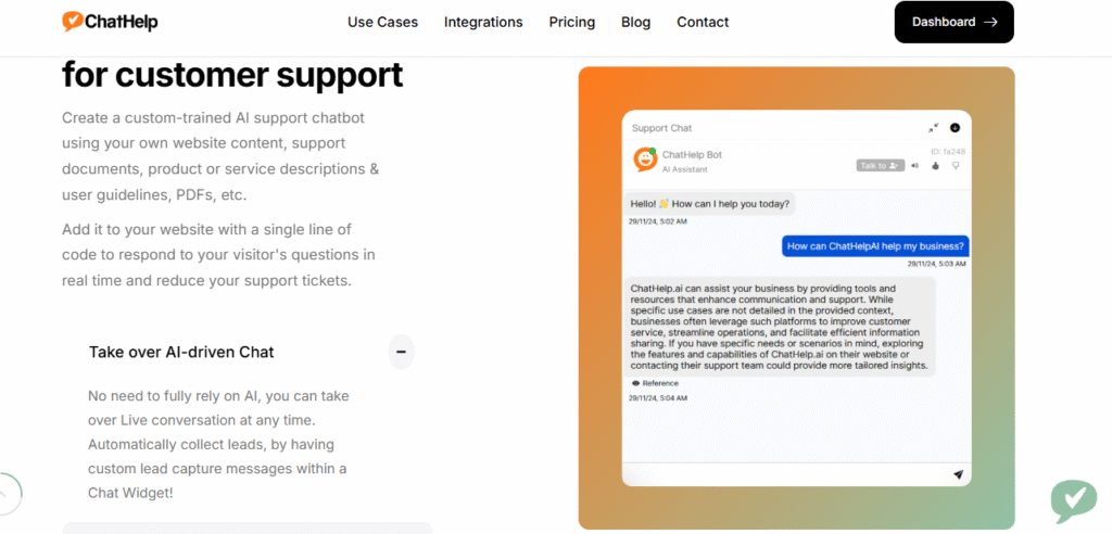 ◀︎ تُعدُّ ChatHelp.ai منصة شاملة تعتمد على الذكاء الاصطناعي لتقديم أدوات دعم العملاء والتعلّم والعمل والإنتاجية في مكان واحد. تتيح المنصة للمؤسسات وأصحاب المواقع إنشاء روبوتات دردشة مدرَّبة على محتوى الموقع والوثائق (مثل صفحات المنتجات، مقالات الأسئلة الشائعة، ملفات PDF، وملفات DOC/CSV) بحيث تردُّ تلقائيًا على استفسارات الزوار وتقلِّل من حجم تذاكر الدعم مع الحفاظ على دقّة الإجابات. يمكن نشر هذه الروبوتات على الموقع بخطّ سطر كود واحد، أو ربطها بقنوات تواصل متعددة، ما يجعلها حلًا مرنًا للمواقع والمتاجر الإلكترونية والشركات الصغيرة والمتوسطة.