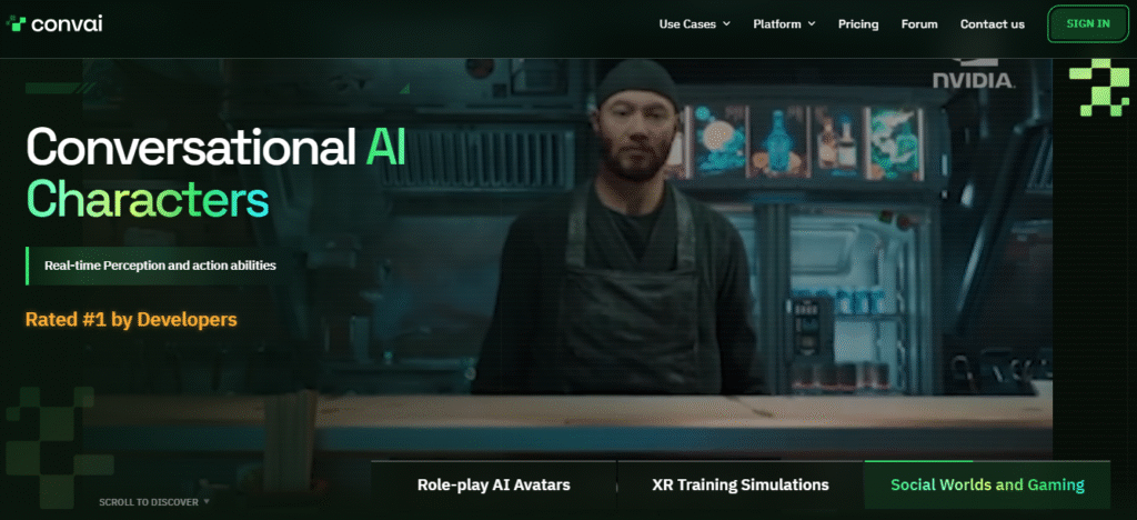 ◀︎ تُمثّل Convai منصة متقدمة للـ Conversational AI مخصّصة لإنشاء شخصيات افتراضية ثلاثية الأبعاد (AI characters / virtual humans) قادرة على التحدّث والتصرّف بطريقة بشرية داخل عوالم افتراضية، الألعاب، وتطبيقات الواقع الممتد (XR). تتيح المنصة للمطوّرين والمبدعين بناء «عقول» للشخصيات تربط بين نماذج اللغة، التعرف على الصوت، ومزامنة حركة الشفاه والوجه لتجربة محادثة واقعية ومندمجة في المشاهد.