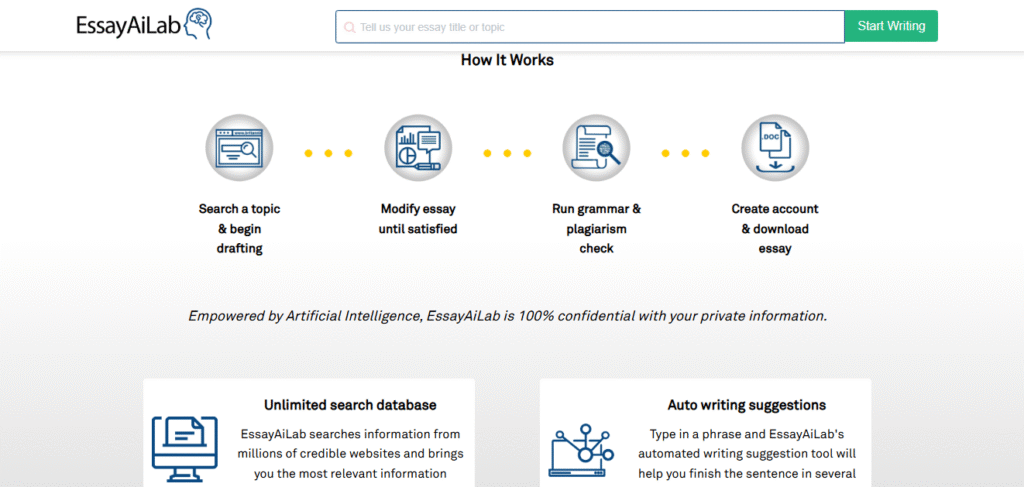◀︎ تُعرَّف أداة Essay AI Lab بأنها منصة متخصصة تعمل بالذكاء الاصطناعي، مصممة خصيصًا للمساعدة في عملية كتابة المقالات. تعمل الأداة كمحرك بحث ومولد محتوى للمقالات، مما يميزها عن أدوات الذكاء الاصطناعي الحوارية مثل ChatGPT، حيث تركز على سير عمل منظم وموجه نحو إنجاز المهام. يتمثل الهدف المعلن للمنصة في مساعدة المستخدمين، وبشكل أساسي الطلاب، على إدارة واجباتهم الأكاديمية بكفاءة.