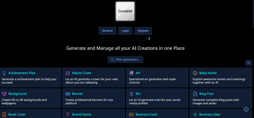 ◀︎تتيح Generor لمستخدميها الدخول إلى مكتبة ضخمة من مولدات المحتوى المدعومة بالذكاء الاصطناعي التي تشمل نصوصًا وصورًا وفيديوهات وحتى أدوات ترفيهية مثل مولد النكات والأسماء، بالإضافة إلى أدوات إنتاج محتوى مهني مثل مولد الشعارات، صور ترويجية، تصميم أغلفة الكتب، وحتى بيانات الأعمال وخطط العمل وغيرها من القوالب المفيدة.
