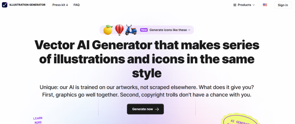 ◀︎ ليس مجرد مولّد صور عشوائي — Illustration Generator تم تصميمه بعناية لتلبية احتياجات المحترفين والمصممين والمحتوى الإبداعي، من دون الحاجة إلى مهارات رسم يدوية. أولاً: لأن الرسم مبني على أسلوب ثابت — فريق Icons8 رسم آلاف الرسوم بنفس الأسلوب، ثم درّب الذكاء الاصطناعي عليها. النتيجة رسوم تبدو “حقيقية” كأنها مرسومة يدويًا أو أن مصمم محترف أنجزها.