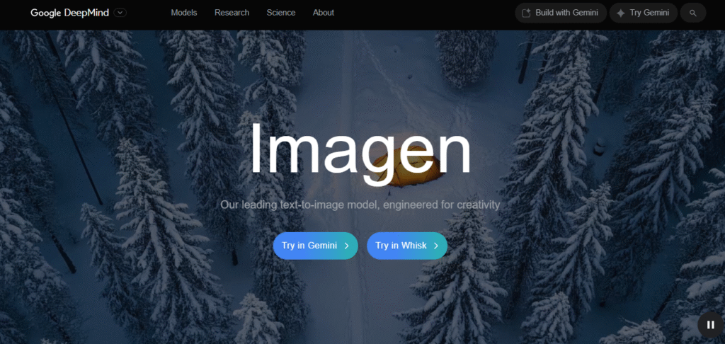 ◀︎ Imagen هو نموذج نص-إلى-صورة رائد طورته فرق Google DeepMind لتمكين التوليد البصري عالي الجودة من أوصاف نصية. يهدف Imagen إلى إنتاج صور فوتوغرافية وفنية بدقة عالية، مع تحسينات ملحوظة في وضوح التفاصيل، دقة الكتابة داخل الصورة (typography)، والواقعية اللونية والضوئية. تم عرض Imagen على صفحة نماذج DeepMind كأحد نماذج التوليد المتقدمة المتاحة للاستكشاف عبر بيئات Google مثل Gemini وWhisk.