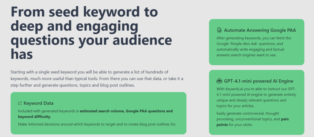 ◀︎ Keywrds.ai أداة بحث كلمات مفتاحية مدعومة بالذكاء الاصطناعي، تمكِّنك من استكشاف الكلمات التي يبحث عنها جمهورك والتي لم يكتشفها منافسوك بعد. تبدأ من كلمة مفتاحية أساسية (“seed keyword”) وتُولّد مئات من الكلمات المفتاحية والموضوعات والأسئلة التي يهتم بها جمهورك.