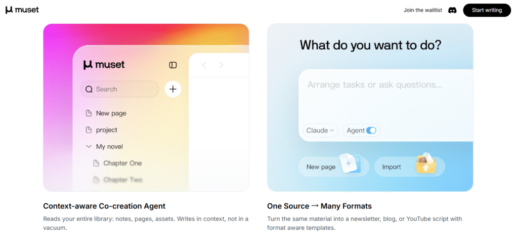 ◀︎ ما يميز Muset AI عن المنافسين هو فهمها العميق للسياق. بتقرأ ملاحظاتك، صفحاتك، أصول المحتوى عندك علشان تساعدك تِكمل المحتوى أنت شغال عليه بدون فقدان الفكرة. القوالب المُهيأة مسبقًا بتسمح بتحويل بسيط وسريع لصيغ متعددة مع الحفاظ على نفس الجودة. ده بيخليها مناسبة للمبدعين، الكتاب، والفرق اللي محتاجة تنشر محتوى متنوع بشكل متسق.