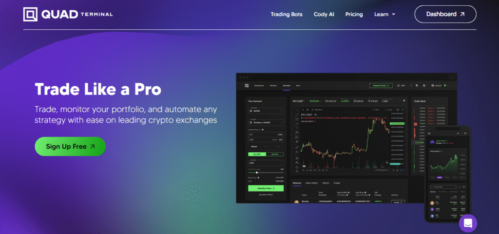 Quad Terminal منصة تداول عملات رقمية شاملة مدعومة بالذكاء الاصطناعي تجمع بين أتمتة الاستراتيجيات وتداول متعدد البورصات وتحليلات محافظ لحظية في واجهة موحّدة. تدعم بوتات جاهزة وCody AI لكتابة الاستراتيجيات بلغة طبيعية، إلى جانب TradingView Bot وCopy Trader وMarket Screener. أسعار مرنة من Free إلى Advanced مع خصومات سنوية ونهج أمني صارم.