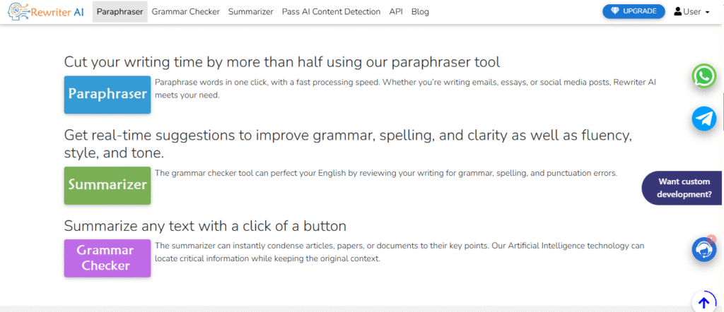 ◀︎ Rewriter.ai هي منصة متكاملة لمعالجة النصوص بالذكاء الاصطناعي تركز على إعادة الصياغة (paraphrasing) والتدوير (spinning) والتحويل اللغوي مع أدوات مساعدة مثل مدقّق القواعد (grammar checker)، ملخِّص النصوص (summarizer)، وواجهات برمجية (API) مخصّصة للاندماج في الأنظمة الأخرى. تُقدّم الأداة وعودًا بارزة — مثل إخراج نص “بجودة بشرية” يمرّ عبر أدوات كشف المحتوى الآلي (pass AI detection) ويدعم أكثر من 50 لغة، ما يجعلها مفيدة للطلاب، المسوقين، منشئي المحتوى والوكالات.