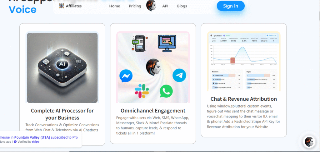 ◀︎ Splutter AI لا تكتفي بالدردشة النصية فقط؛ بل تدعم بوتات صوتية (Voicebots) يمكن اختبارها مباشرة عبر مكالمة هاتفية، وتقدم تتبّعًا لعائدات المحادثة (Revenue Attribution) بربط محادثة الزائر بمعرّف الزائر وبيانات الدفع (Stripe integration) لقياس القيمة الحقيقية من قنوات الشات. كما تتيح المنصة اختبار البوتات على الويب والهاتف، عرض سجلات المحادثات، وإجراء تحليلات متقدمة لقياس معدلات التحويل والأداء.