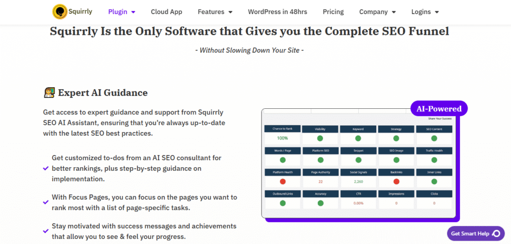 ◀︎ تُمثّل Squirrly SEO إضافة وواجهة SaaS مدمجة مخصّصة لمواقع ووردبريس تهدف إلى جعل عملية تحسين محركات البحث (SEO) أقل تعقيدًا وأكثر توجيهًا عمليًا للمستخدمين غير المتخصصين والمحترفين على حد سواء. تجمع الأداة بين قدرات الذكاء الاصطناعي وواجهات المستخدم البسيطة لتقدّم “مستشار SEO شخصي” يزوّدك بأهداف قابلة للتنفيذ، مهام خطوة بخطوة، وتحليلات تُرشدك إلى كيفية رفع ترتيب صفحاتك على محركات البحث.