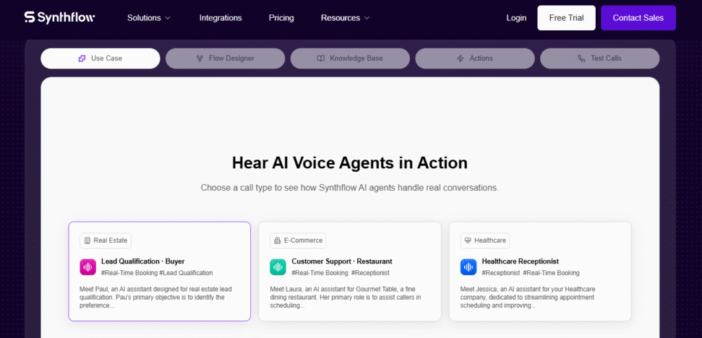 ◀︎ تبرز Synthflow في دعمها لعمليات صناعية محددة: أتمتة المواعيد والحجوزات، تأهيل العملاء المحتملين، استرجاع حالات الطلبات، وجمع بيانات العملاء عبر مكالمات آمنة ومقروءة. تُقدّم أدوات تحليلات وتقارير متقدمة تسمح بقياس أداء الوكلاء (معدلات الرد التلقائي، مدة المكالمة المتوسّطة، نسب التحويل)، مما يمكّن فرق العمليات من تحسين النصوص وسيناريوهات التفاعل بمرور الوقت. كما أن التزامها بمعايير الأمان والخصوصية يُسهِم في اعتمادها لدى قطاعات حساسة مثل التمويل والرعاية الصحية.