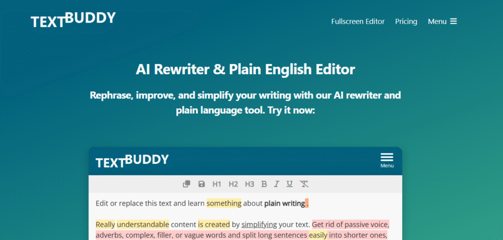 ◀︎ تُعد أداة TextBuddy محرّر نصوص ذكي يركّز على تحويل الكتابة المعقّدة إلى لغة بسيطة وواضحة، ويعمل كمساعد لتحليل النصوص وإعادة صياغتها وفق قواعد الـ Plain Language (اللغة البسيطة). تم تطوير الأداة لتسهل على الكتّاب، المسوقين، المحرّرين، والطلاب عملية تنظيف النص من الجمل الطويلة، الكلمات المعقّدة، العبارات المبهمة، والصيغ السلبية، مع توفير اقتراحات مرادفات ومقترحات لتحسين القابلية للقراءة. الأدوات المدمجة فيها تشمل مقاييس قابلية القراءة (Readability score)، تقييم مستوى اللغة (مثل CEFR)، إحصاءات النص، وميزات رصد تكرار الكلمات والأوصاف النحوية.