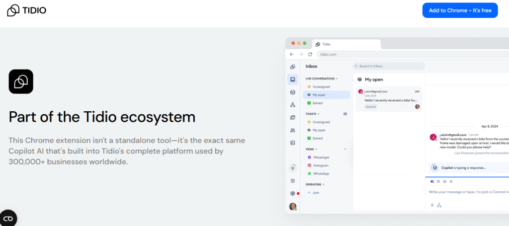 ◀︎ Tidio Copilot هو مساعد ذكاء اصطناعي مجاني يُقدّم اقتراحات ردّ جاهزة لوكلاء خدمة العملاء مباشرة داخل واجهات المساعدة (helpdesk) عبر إضافة متصفح Chrome أو كجزء من نظام Tidio. يحلل المحادثات (دردشة حية، إيميل، سوشيال) ويقترح ردودًا دقيقة ومتوافقة مع سياسة شركتك حتى يوفر وقت الوكلاء ويقلّل الأعمال المتكررة.