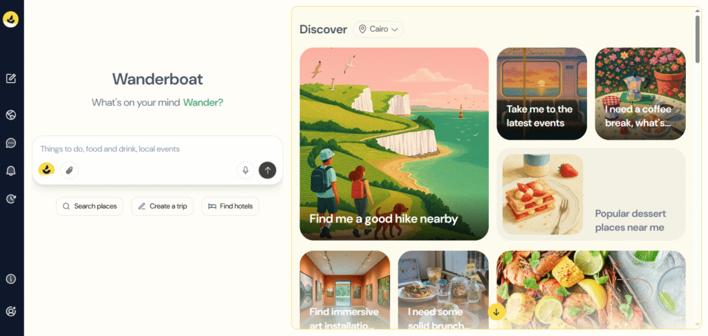 ◀︎ على عكس التطبيقات السياحية التقليدية التي تكتفي بقوائم جاهزة من المعالم أو المواقع، فإن Wanderboat AI صُمم ليعمل كمنصة بحث حوارية وتفاعلية، حيث يمكنك سؤاله بشكل مباشر: “ما أفضل مكان لتناول وجبة إفطار محلية قريبة من الفندق؟” أو “أين يمكنني التقاط صور مذهلة لغروب الشمس؟” ليقدم لك إجابات دقيقة، مدعومة بخرائط، مقاطع فيديو، وصور واقعية. هذه المرونة تجعل تجربة التخطيط للسفر أكثر قربًا من الحديث مع صديق يعرف كل تفاصيل المكان.