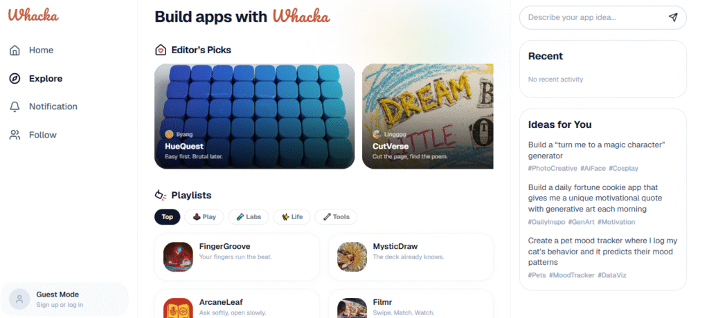 ◀︎ تبرز Whacka بكونها تركز على “التجربة الفورية” و”الإبداع السريع”، بدلًا من المشاريع الطويلة والمعقدة. فهي تمنح المستخدم إحساسًا بالإنجاز السريع، حيث يمكنه رؤية فكرته تتحول إلى تطبيق خلال دقائق. وهذا ما يجعلها خيارًا مثاليًا لكل من يريد استكشاف أفكاره، أو إنشاء أدوات بسيطة، أو حتى مجرد الاستمتاع بتجربة بناء التطبيقات بطريقة جديدة ومبتكرة.