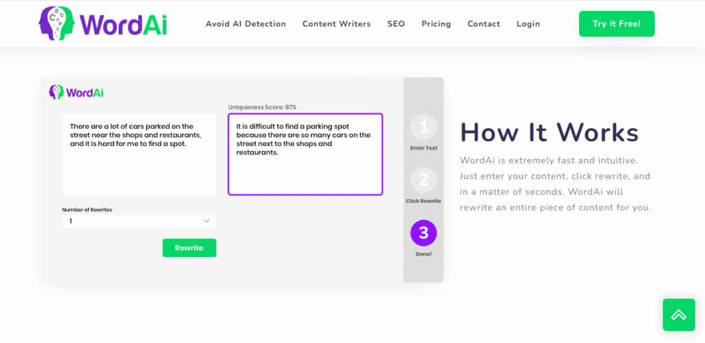 ◀︎ تُعرّف أداة WordAI نفسها بأنها محرك متطور لإعادة صياغة النصوص، مدعوم بنماذج تعلم الآلة المتقدمة، مما يميزها بشكل جوهري عن أدوات “تدوير المقالات” (Article Spinners) التقليدية. يكمن الاختلاف الأساسي في قدرة الأداة على فهم سياق ومعنى الجمل قبل الشروع في إعادة كتابتها من الصفر. هذا النهج، الذي يمكن وصفه بـ “إعادة الصياغة المفاهيمية” بدلاً من “الاستبدال المعجمي”، هو حجر الزاوية في عرض القيمة الذي تقدمه الأداة، حيث يهدف إلى إنتاج محتوى عالي الجودة، مقروء، ويحاكي الكتابة البشرية. هذا التمييز حاسم للمستخدمين الذين يهتمون بجودة المحتوى ويسعون لتجنب المخرجات الركيكة وغير المفهومة التي كانت تنتجها تقنيات التدوير القديمة.