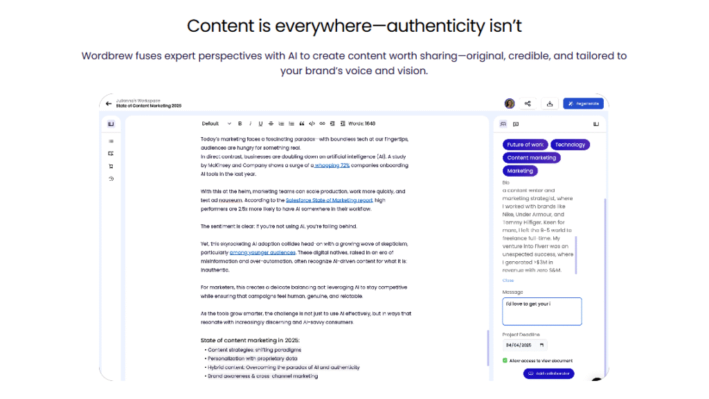 ◀︎ تُعرّف Wordbrew نفسها كمنصة شاملة ومتكاملة تهدف إلى دمج الخبرة البشرية الأصيلة مع قدرات الذكاء الاصطناعي المتقدمة وليست مجرد اداة للكتابة. يتمحور جوهر المنصة حول فلسفة واضحة: تحويل المعرفة والخبرات الكامنة لدى الخبراء إلى محتوى حقيقي وموثوق يعزز من سلطة العلامة التجارية ويدفع نموها. وبهذا، فإن وظيفتها الأساسية ليست مجرد توليد المحتوى، بل تأصيل المحتوى بناءً على رؤى بشرية حقيقية.