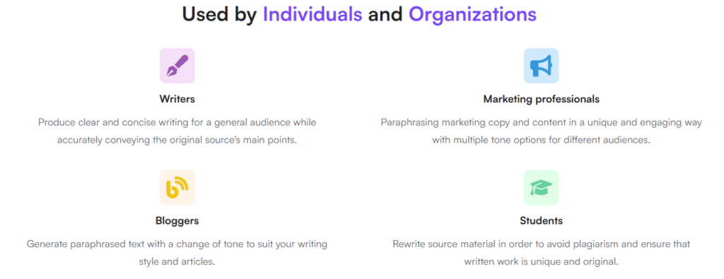 ◀︎ تُعدّ WordfixerBot أداة ذكاء اصطناعي متخصصة في إعادة صياغة النصوص (Paraphrasing) وتنقيحها، مصمّمة لمساعدة المستخدمين على تحسين جودة كتابتهم من حيث الأسلوب، القواعد، النحو، والمفردات. تتيح الأداة للمستخدم أن يدخل نصًا، يختار النبرة (tone) التي يريد أن تُعاد بها الصياغة — مثل رسمية، عفوية، إبداعية، وغيرها — ثم تُعيد الأداة إنتاج النص بحيث يحافظ على المعنى الأصلي لكنه يبدو جديدًا ومُحسَّنًا.